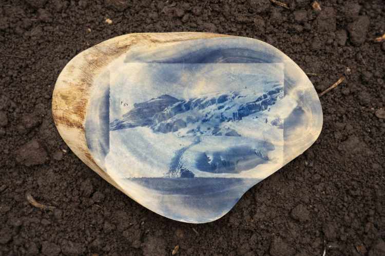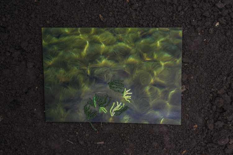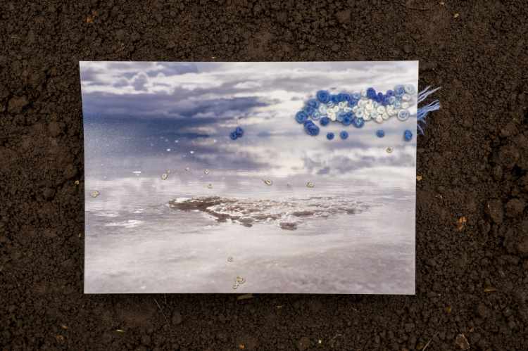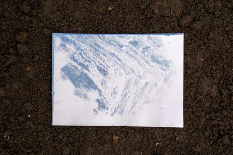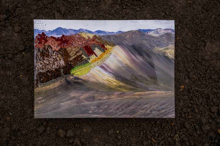 Los procesos materiales desempeñan un papel central en el proyecto. La cianotipia, con sus tonos azul oscuro, evoca el agua, la atmósfera y la fragilidad ecológica. Dado que la imagen se revela a través de la luz del sol, el proceso establece una relación directa con la presencia misma del sol que moldea los entornos andinos. El bordado introduce una dimensión táctil de cuidado y memoria, donde el hilo actúa como una cartografía afectiva que traza rutas, cicatrices y continuidades a través de la superficie fotográfica.