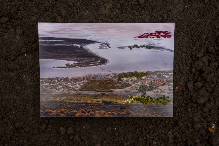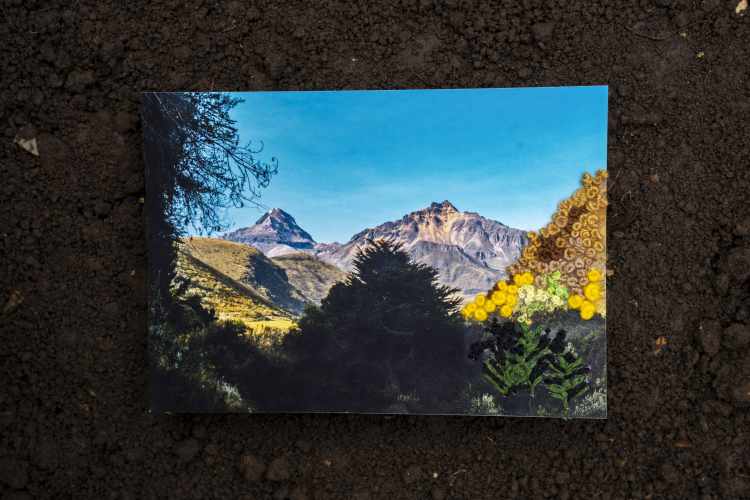 Material processes play a central role in the project. The cyanotype, with its dark blue tones, evokes water, the atmosphere, and ecological fragility. Since the image is revealed through sunlight, the process establishes a direct relationship with the very presence of the sun that shapes the Andean environments. Embroidery introduces a tactile dimension of care and memory, where the thread acts as an affective cartography that traces routes, scars, and continuities across the photographic surface.